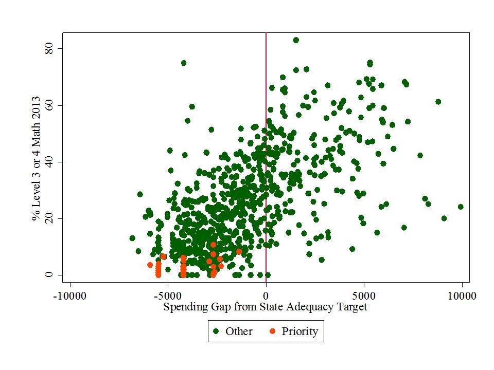 Let’s hit a few more figures here, linking the Governor’s death penalty claims with the funding shortfalls he persistently endorses. This graph shows the average spending gaps of districts of schools falling in the state’s accountability classifications – where presumably, those Priority Schools are the ones on death row.