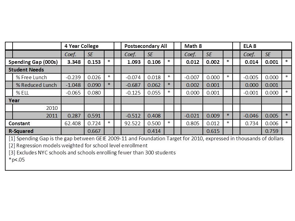 Table 1 provides a multiple regression analysis which asks the question – to what extent are spending gaps associated with outcomes, among schools with similar percentages of low income or non-English speaking children, in the same year. In other words, are the spending gap to outcome relationships displayed in previous figures merely a function of the relationships between outcome gaps and student population characteristics, and spending gaps and student characteristics? Table 18 shows that in each case, for each outcome measure, outcome gaps are associated with spending gaps, even among districts with similar student needs. A$1,000 reduction in spending gap is associated with a 3.3% increase in 4yr college attendance, 1.1% increase in postsecondary attendance, 1.2% increase in 8th grade math scores and 1.4% increase in 8th grade ELA scores.
