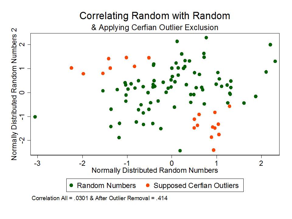 Now, applying NJDOE Cerfian outlier exclusion, I exclude those points where X (first set of numbers) >.5 & Y (second set)<-.5 [lower right], and similarly for the upper left. Ya’ know what happens when I cut of those pesky supposed outliers in the upper left and lower right. The remaining “random” numbers now have a positive correlation of .414! Yeah… when we chisel a pattern out of randomness, it creates… well… sort of… a pattern.