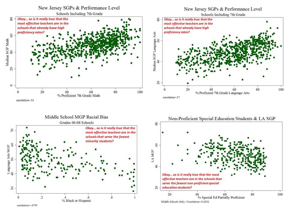 Once again, they ignore outright not just the possibility, but the well documented statistical reality [reiterated here] that the SGPs (in addition to not even being designed to infer teacher effect) are in fact severely biased with respect to poverty, minority, special ed concentrations and initial average scores or proficiency rates. Thus the requirement to align observation scores with SGPs is a requirement to make those ratings comparably biased.