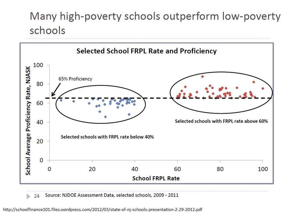 A while back, in a report from the NJDOE, we learned that outliers are all that matters. They are where life’s important lessons lie! Outliers can provide proof that poverty doesn’t matter. Proof that high poverty schools – with a little grit and determination – can kick the butts of low poverty schools. We were presented with what I, until just the other day might have considered the most disingenuous, dishonest, outright corrupt graphic representation I’ve seen… (with this possible exception)!