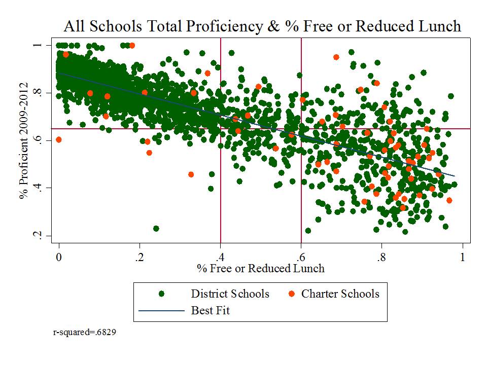 Yep, that’s right, % free or reduced priced lunch alone explains 68% of the variation in proficiency rates between 2009 and 2012 (okay, that’s one more year than in the misleading graph above, but the pattern is relatively consistent over time).