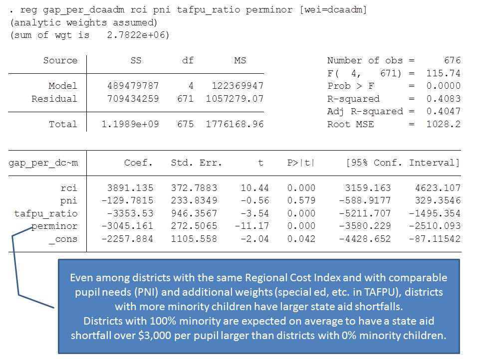 Here’s a quick multivariate run of the data to determine whether otherwise similar districts with more minority children have bigger funding gaps, where otherwise similar is determined with respect to components of the formula itself – the Regional Cost Index, Pupil Need Index and the additional weights included in the Total Aidable Foundation Pupil Unit count.