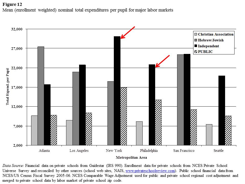 Private Independent DAY Schools tend to spend per pupil nearly twice as much as per pupil as local public districts in their same labor market!