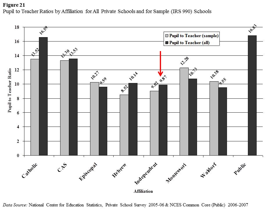 What do we know about Private Independent School pupil to teacher ratios (for lack of specific, comparable class size data)? Well, back in 2009 when I did my report dissecting the private school market place by affiliation, I found that NAIS and NIPSA schools tended to provide pupil to teacher ratios slightly greater than half that of public districts.