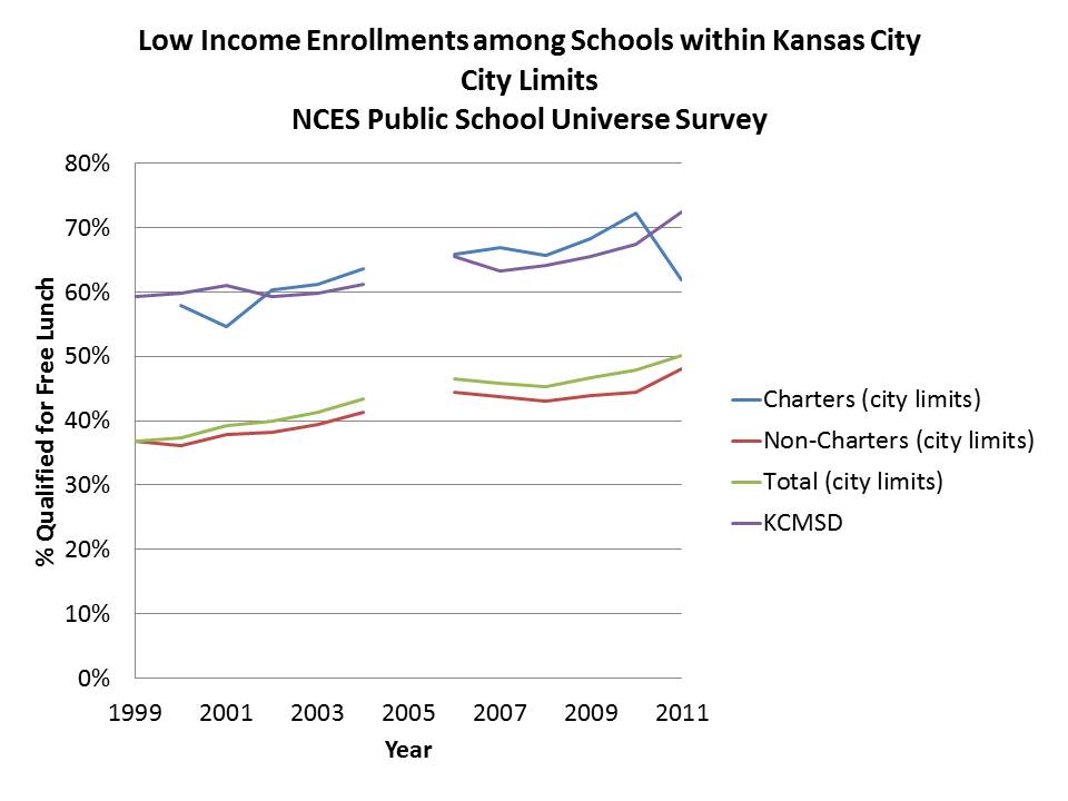 The bottom line is that charters are certainly no panacea for solving the woes of KCMSD. Rather, like district schools, their performance varies, around a similar average, with those serving higher poverty populations having the most difficulty.