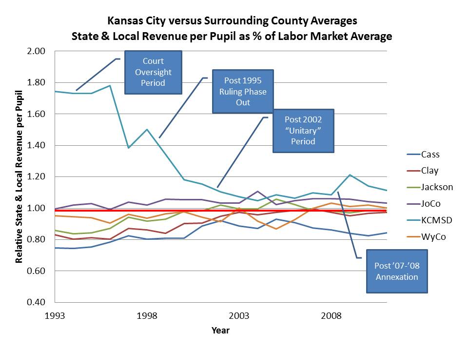 Much has been made of the desegregation litigation that, as the story goes, made Kansas City the highest spending school district in the world… for decades on end… all for naught. Figure 3 gives us a story lined walk-through of the relative state and local revenues of KCMSD compared to the average for its surrounding labor market from 1993 to 2011. Funding really started scaling up around 1988 toward a peak around 1993. But after the U.S. Supreme court in the 1990s indicated that current remedies went a bit too far (taking an approach of trying to attract suburban residents into the city’s magnet schools – because the judge really had no other way to achieve integration), the relative funding for KCMSD schools fell precipitously over time (actually what happened is that it stagnated – and other caught up).