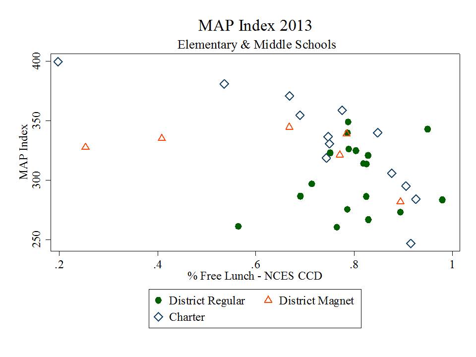 But what does KC charter performance look like in context? Here are a few figures focused on lower grades (up to 8th) schools in Kansas City, including charter, magnet and regular district schools (though some are special emphasis). Figure 7 shows the MAP Index for schools by percent free lunch. The average for charters is slightly higher (as in the above figure) for charters, but charter performance, like district school performance varies, with the charters serving the highest poverty populations really struggling as one might expect.