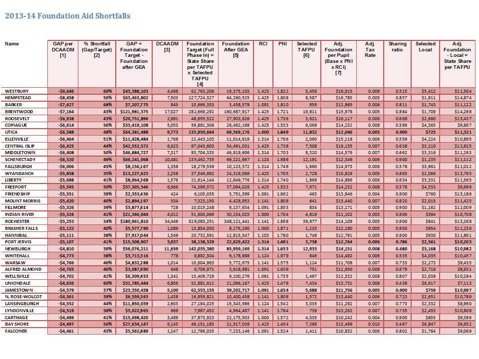 The following table lists those districts with the largest per pupil gaps in State Foundation Aid in 2013-14.. In other words, these are the districts with the largest differences between the Foundation Aid the districts should have received had the State actually funded the Foundation Aid formula compared to the actual Foundation Aid the districts receive after the State’s Aid freeze and cuts are applied. Detailed documentation of the calculations in the table is presented in the appendix.