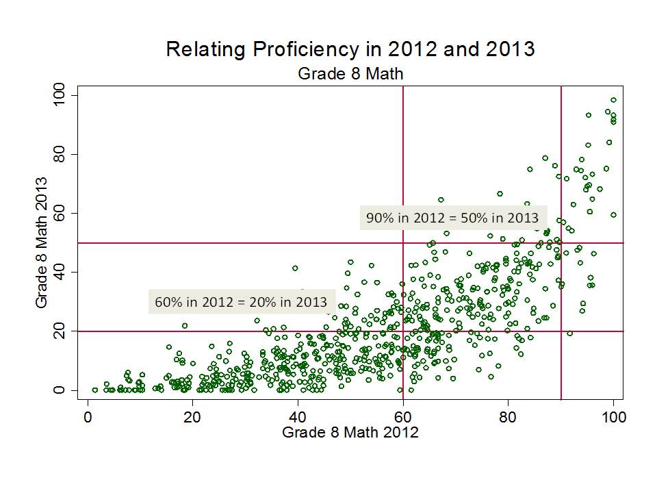 This next figure shows the resulting shift of the change in assessments from 2012 to 2013, also for 8th grade math. Again, I’ve applied ballpark cutpoint comparisons. Here, a school where 60% were proficient in 2012 was likely to have 20% proficient in 2013. A school where 90% were proficient in 2012 was likely to have 50% proficient in 2013. If, as state policymakers argue, the 2013 assessments do more accurately represent the standard for college readiness, and thus the constitutional standard of meaningful high school education, it is quite likely that the cost of achieving that constitutional standard is much higher than previously estimated. Notably, only a handful of schools surpass the 80% threshold on math proficiency for the 2013 assessments.