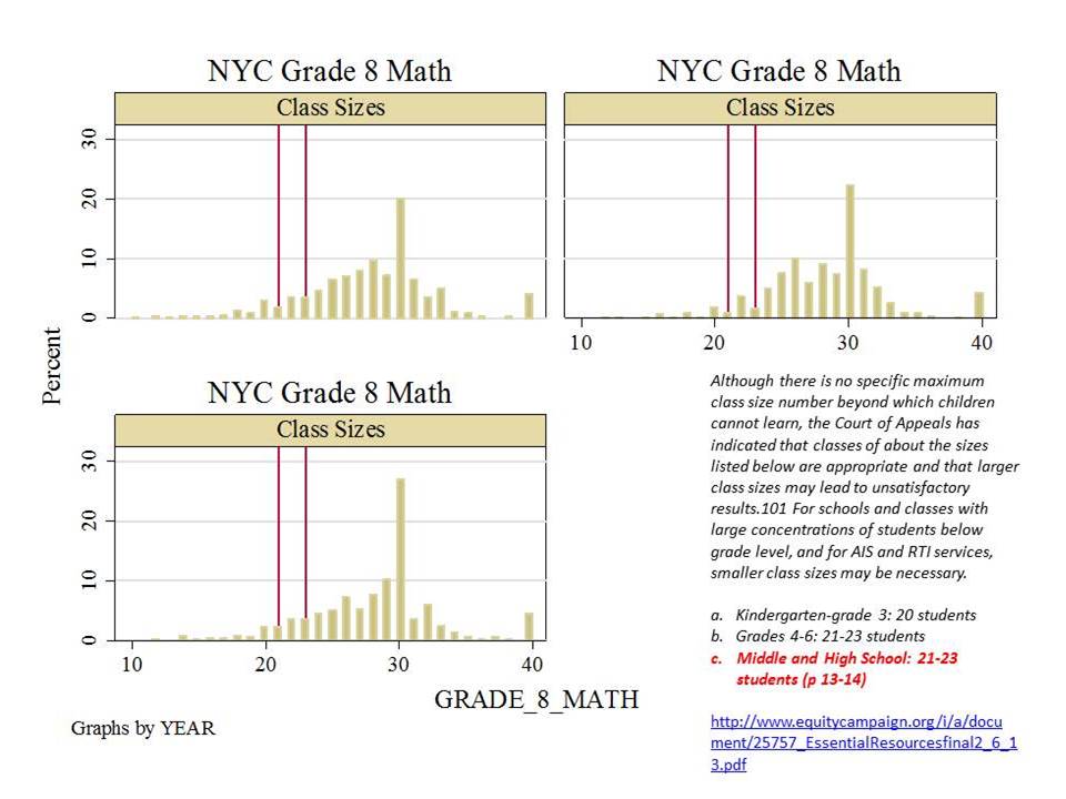 In higher poverty settings, most 8th grade class sizes already exceed 23 students and most in New York City far exceed that. It would be utterly foolish to extrapolate the assertion of minimal downside to increasing an NYC 8th grade math class from, say, 32 up to 44 students (if the room could even hold them).