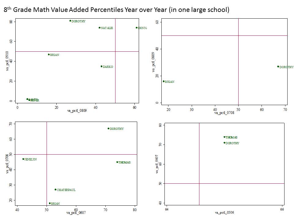 Here are the 8th grade math teachers and 7th grade math teachers with their year over year value-added percentiles. For example, we see that in 2008-09 Dorothy is below average (left of vertical line) but in 2009-10, Dorothy is above average. The same is true for Natalie. Donna is above average both years and two (overlapping) are below average both years. Looking back an additional year, we only have one carry over teacher, Dorothy, who is above average again.