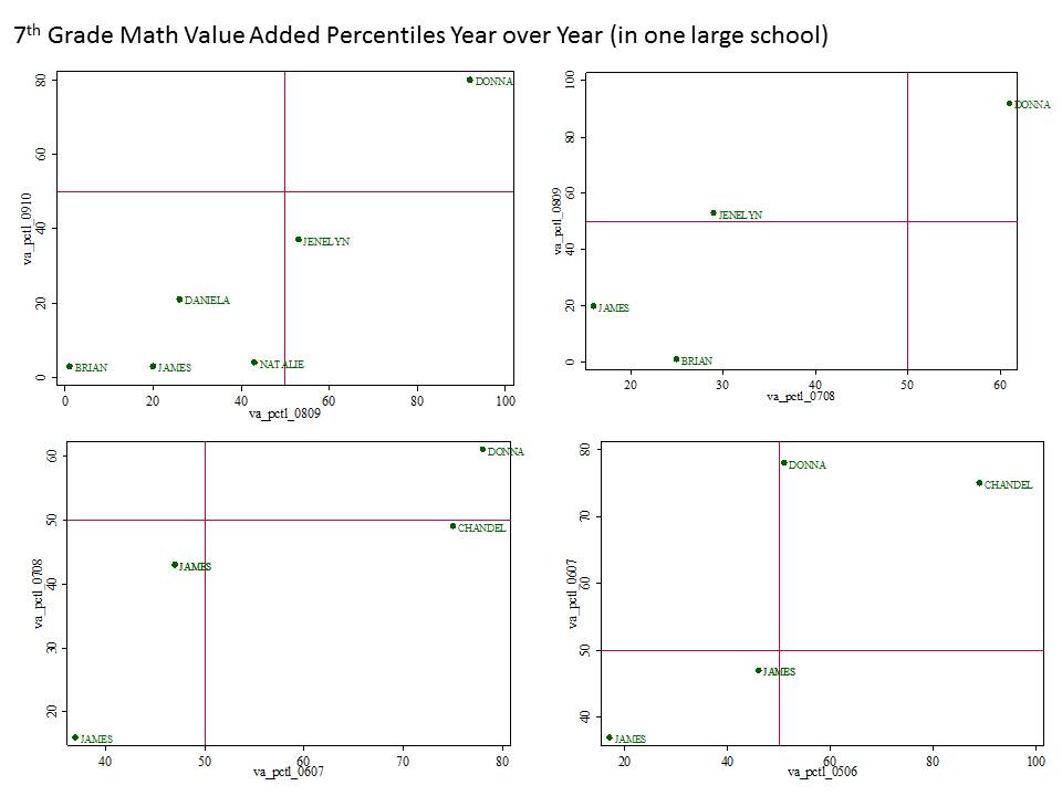 Donna does show up for 7th grade (below), and is above average there as well, but only average back in 2005-06. Otherwise, a) we don’t have that many teachers who even persist in the school from year to year, and b) those who do have percentile ranks that jump all over the place.