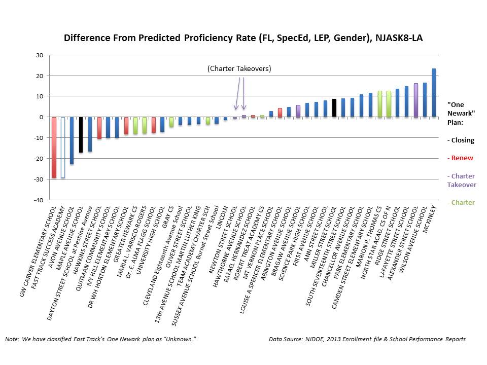 There is a clear correlation between student characteristics and proficiency rates on state tests. When we control for student characteristics, we find that many of the schools slated for sanction under One Newark actually have higher proficiency rates than we would predict. Further, the Newark charter schools that may take over those NPS schools perform worse than prediction.