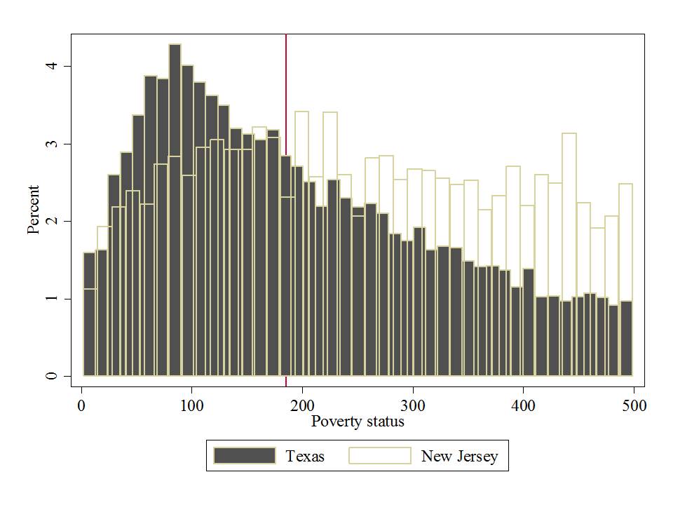 In New Jersey, the income ratio is about 6:1 for those above versus those below the 185% threshold. In Texas, the ratio is about 4.5:1. And that matters when comparing achievement gaps!