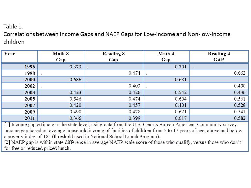 Table 1 summarizes the correlations between income and outcome gaps for each NAEP math and reading assessment, over several years.