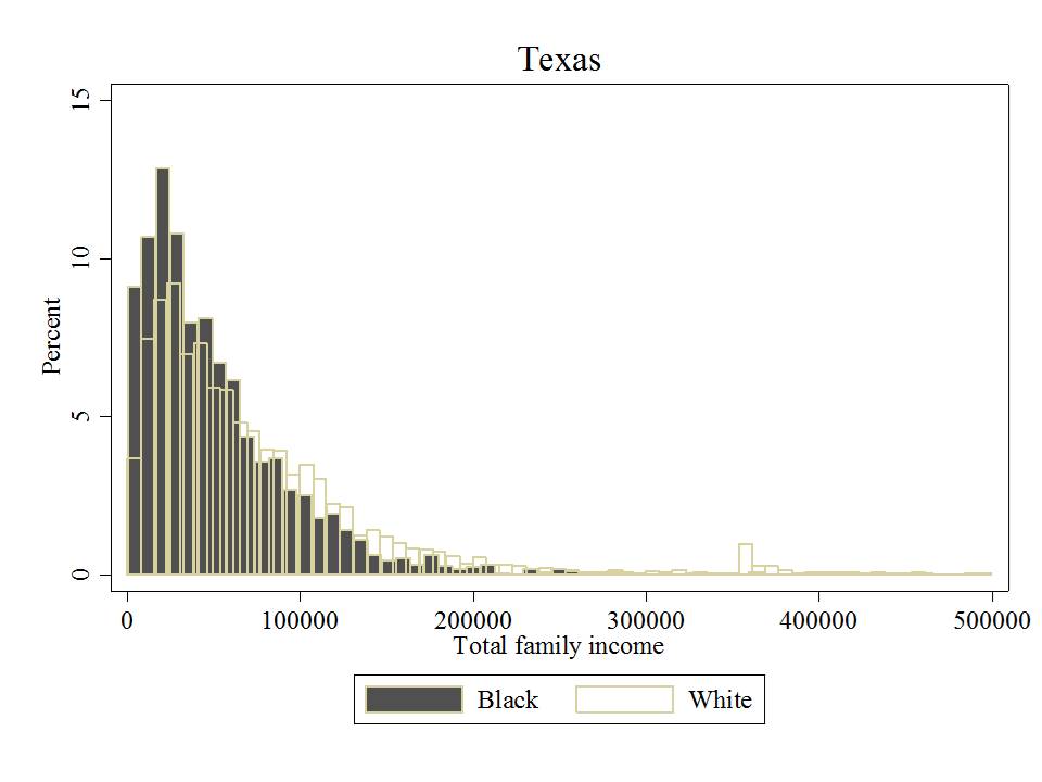 In Texas, the ratio of family income for white families to black families is about 1.5 to 1.