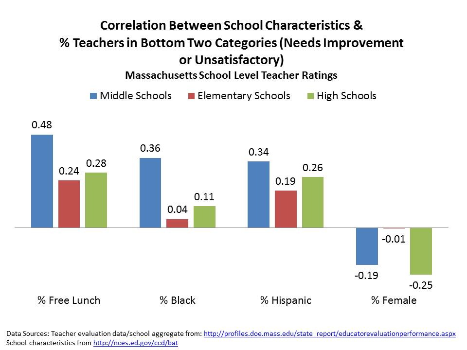 This post builds on my most recent post in which I challenged the naive assertion that current teacher ratings really tell us where the good teachers are. Specifically, I pointed out that in Massachusetts, if we accept the teacher ratings at face value, then we must accept that good teachers are a) less likely to teach in middle schools, b) less likely to teach in high poverty schools and c) more likely to teach in schools that have more girls than boys.