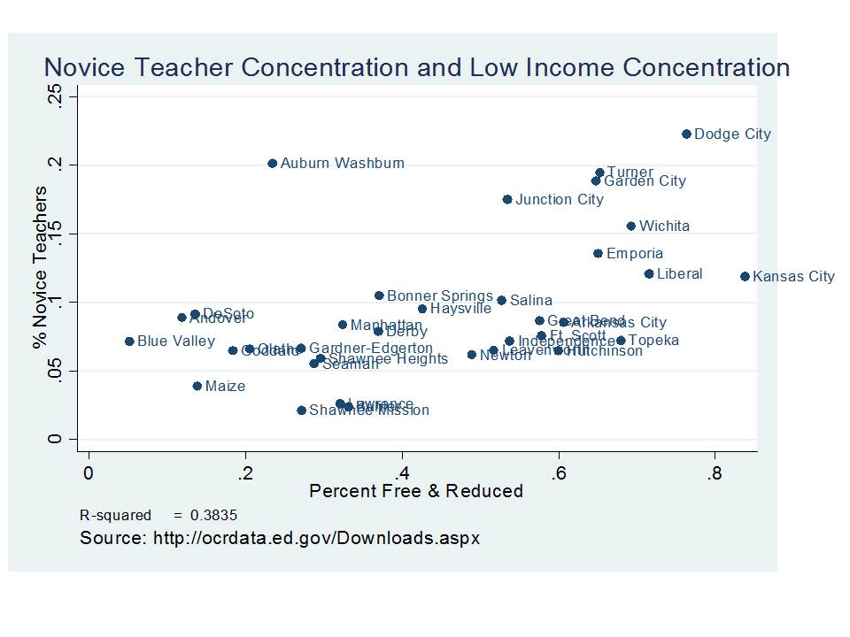 Figure 8 shows that districts with higher concentrations of low income populations have systematically higher concentrations of novice teachers (in their first or second year). In fact, low income concentration alone explains nearly 40% of the variation in novice teacher concentration. Districts like Kansas City have much higher rates of novice teachers than neighboring suburban districts, including those which are growing rapidly and have increased demand for new teachers. This finding suggests that districts like Kansas City and Turner have much higher turnover rates than districts like DeSoto, Blue Valley or Shawnee Mission. Yet, current Kansas school finance policies provide financial support for teacher retention in the districts already advantaged with systematically lower concentrations of novice teachers.