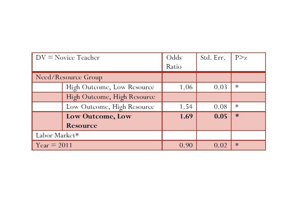 - Table 4 shows that a teacher in a low resource, low outcome district is 53% (TAKS model) or 40% (college readiness model) more likely to be novice than a teacher in a high resource, high outcome district.