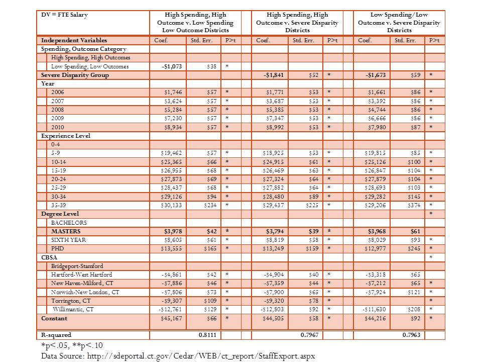 The results of the regression analysis are presented in Table 1. The results indicate that salaries for teachers with more experience are higher, that teachers with advanced degrees, controlling for experience level are paid more, and that teachers tend to be paid less in regions other than Bridgeport-Stamford, and particularly so in the more rural parts of the state. With respect to differences across the three categories of districts, the results indicate that all else equal: