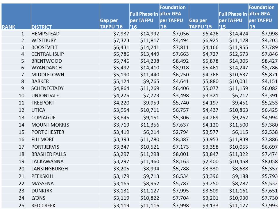 I close with an update of the 50 districts with the largest funding gaps going into 2015-16. And here they are: