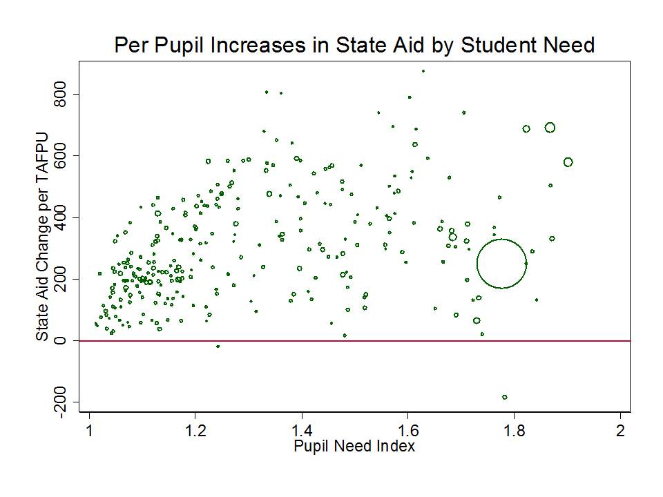 Let’s start with the positive. Yes, the adopted state budget does, on average, increase per pupil state aid and does so in higher amounts in districts serving needier pupils: