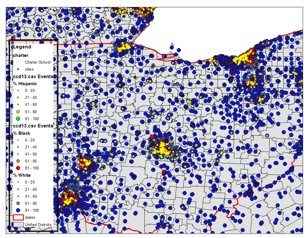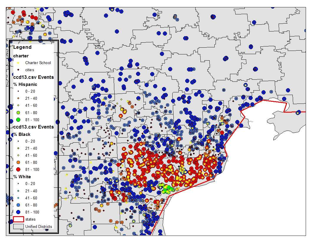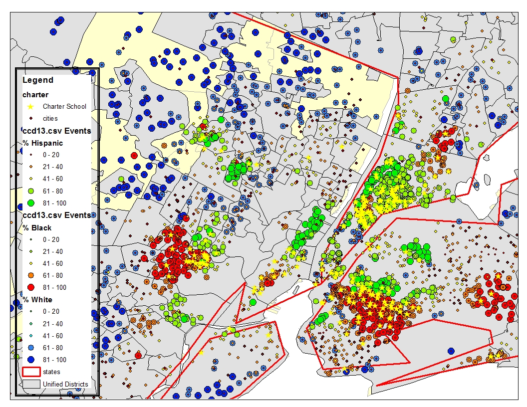 Let’s take a spacial and racial look at the distribution of “chartering” using the 2013 Common Core of Data Public School Universe Survey. In the following maps of major metropolitan areas:
