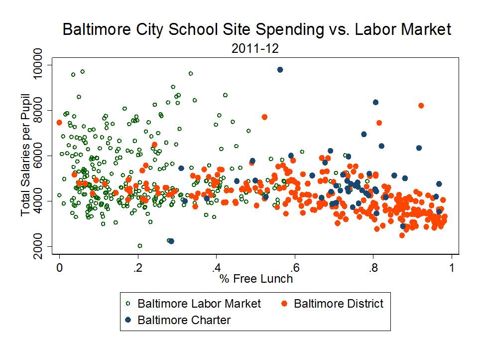 I decided to dig a bit deeper based on recently released data from the U.S. Department of Education, which report school site per pupil total salary (and instructional salary) expenses. Now, readers of my blog know that I’m quick to point out that the flexibility of districts to reshuffle resources across schools within districts depends substantially on states providing those districts sufficient resources to begin with. As noted above, Baltimore City really isn’t provided sufficient resources to address its extreme needs. But, I must say that in my exploration of within-district resource allocation in this case, what I found was a bit disturbing, but not surprising.