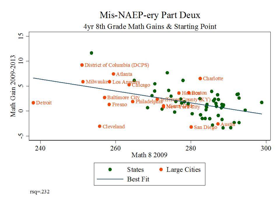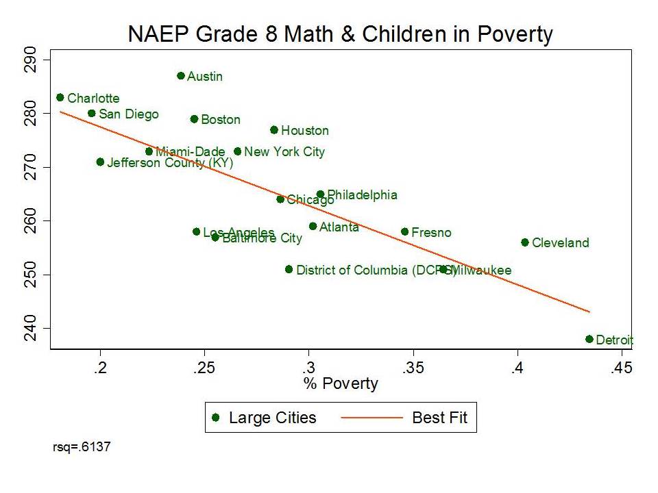 To summarize, Baltimore does somewhat less well than expected on mean NAEP scale scores given measures of their students’ low income status, but they certainly aren’t a striking outlier here.
