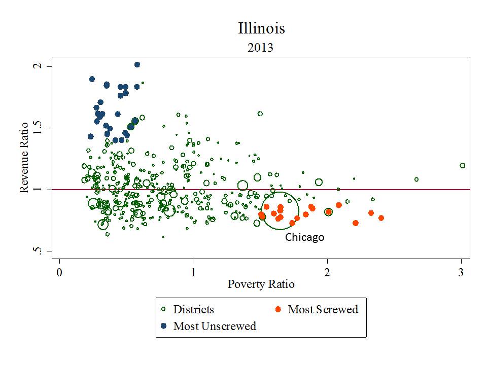 Dude… that’s just obscene. Chicago, and many of it’s high poverty, high minority concentration surroundings have far less than average revenue per pupil, which many of their low poverty neighbors have more than 50% higher than average revenue per pupil. Put bluntly, that’s just a stupid huge unfair disparity.