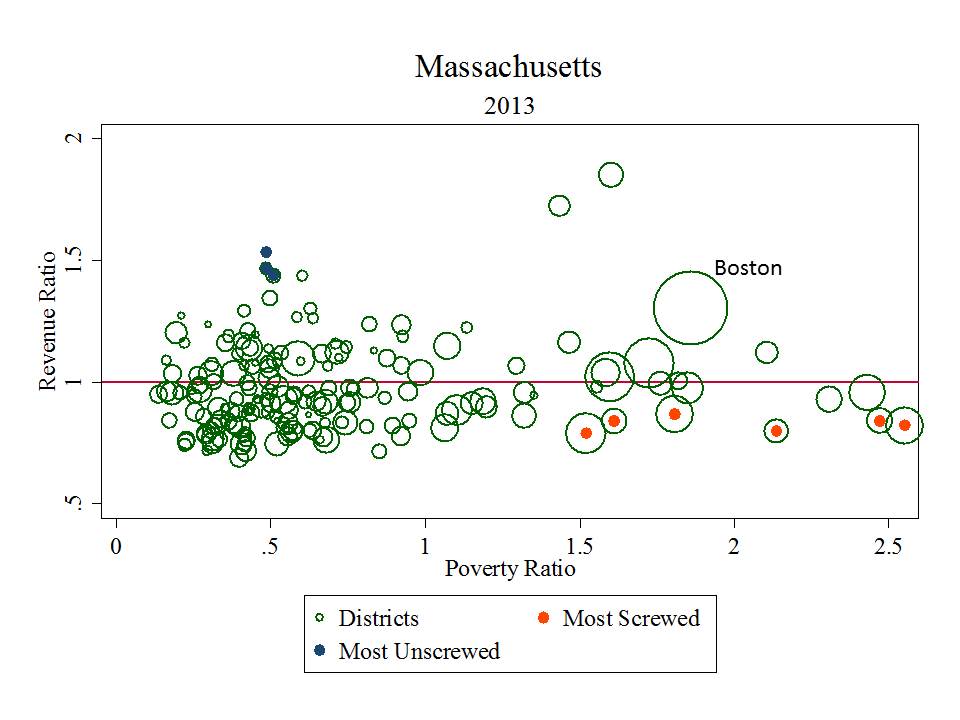 Funding fairness in Massachusetts has collapsed similarly to that of New Jersey, reverting to levels not seen since around 2000. This despite numerous studies showing the positive influence of the scale up in targeted resources. But the distribution of revenues in Massachusetts has been less consistent than that of New Jersey, and has declined even more unevenly. Figure 4 shows the 2013 pattern.