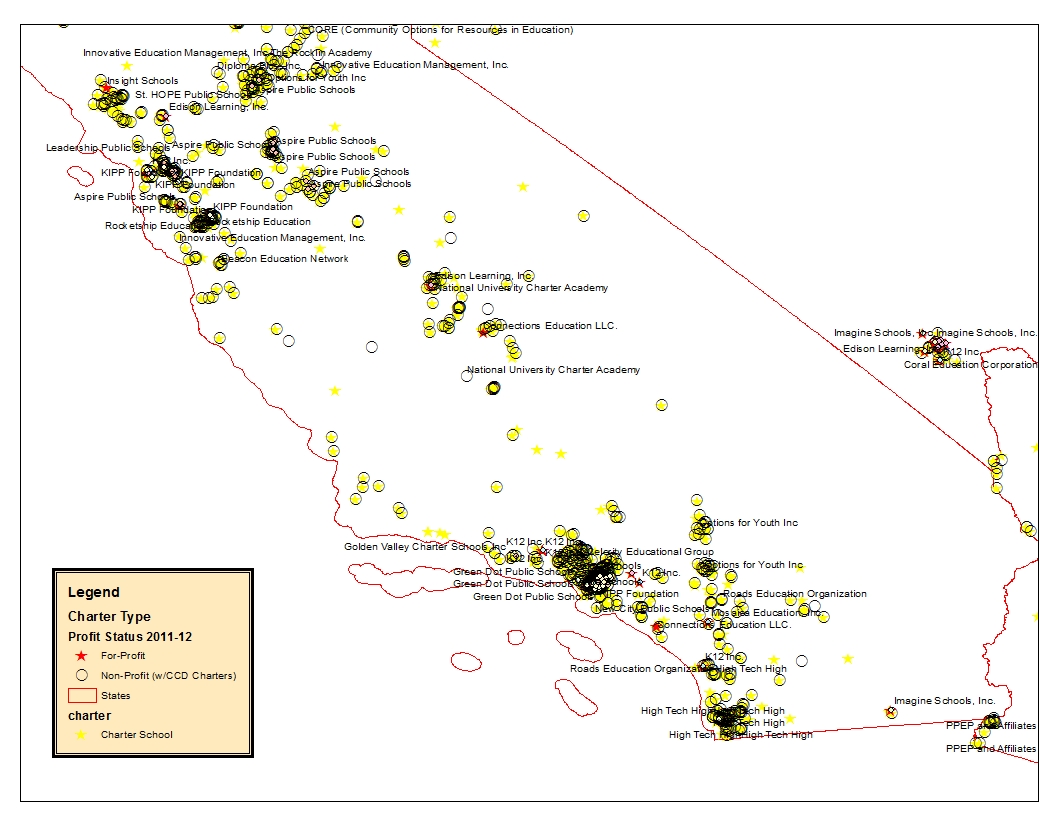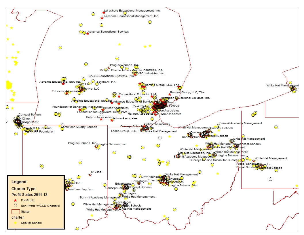 In these maps, I’ve only labeled the management company for companies that managed at least 20 schools in our 2011-12 data. Management company data linked from prior work by Gary Miron and colleagues (diligently matched/vetted by my doc student Mark Weber. Mapped version here from prelim data set). Note that a common issue with mapping this type of data is that the school address may show up at the corporate address rather than the actual school location.