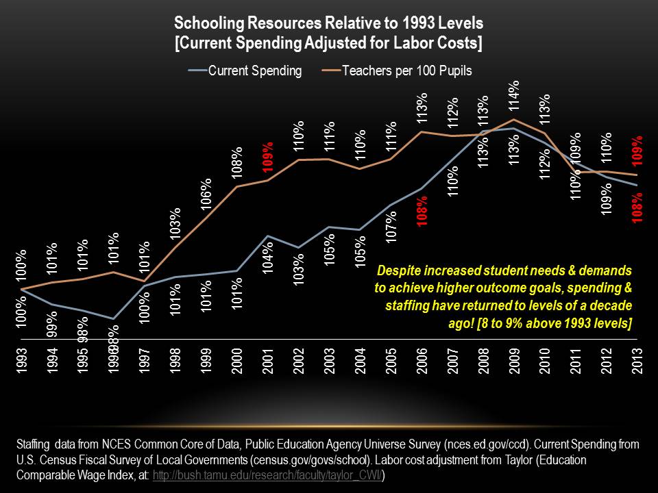 Two small caveats: 1) a portion of the downward drift can appropriately be attributed to the happy fact that people are living longer, and also that families have shrunk. There are slightly more taxpayers per student than there were in the past. 2) I have mixed feelings about using the Taylor education labor cost series (or similar). The rising costs of education are important, and they are an issue worthy of separate consideration. See Ed100 lesson 8.2. http://ed100.org/support/eddollars/ Why separate them? Because the elements driving costs represent both market conditions and policy choices. For example the traditional villain in the “fast-rising costs” story is teacher pay… but that story doesn’t seem to wash, since growth in teacher salaries has actually merely kept pace with median wage growth. See Ed100 lesson 3.1 http://ed100.org/teachers/talent/.