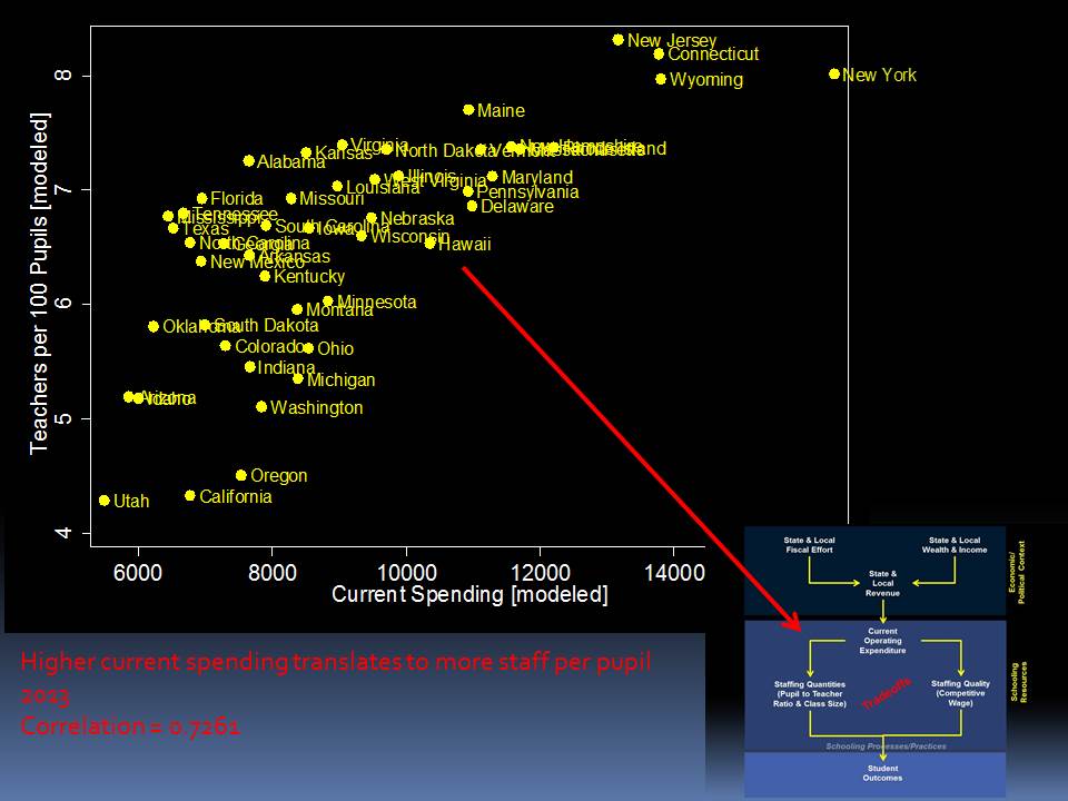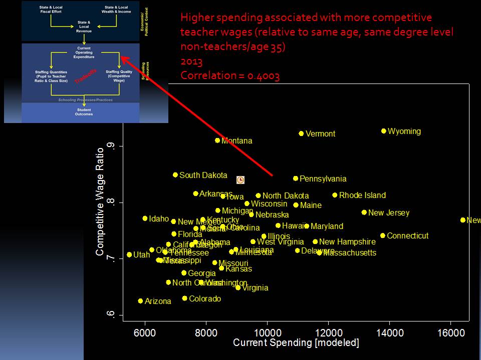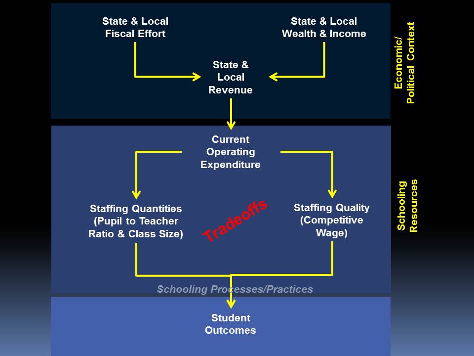 I begin with a relatively simple model of how effort and funding translates to resources, and how those resources ultimately provide the enabling conditions for the classroom conditions and practices that lead to better student outcomes. Despite the assertions of some, the schooling equation remains relatively simple – Schooling remains a human resource intensive endeavor, requiring competitive wages to recruit quality teachers and other school staff, and requiring sufficient capital outlay as well to provide the setting for schooling. The search for the holy grail of alternative technologies (broadly speaking, any substantive changes to educational organization/practices) that would substantially reduce the costs of achieving the same outcomes, has not, as of yet panned out. I have discussed this issue generally (as well as methods for studying it), and with specific reference to teacher compensation, as well as “chartering” [where the most aggressive technological substitutions in particular have been massive failures thus far].