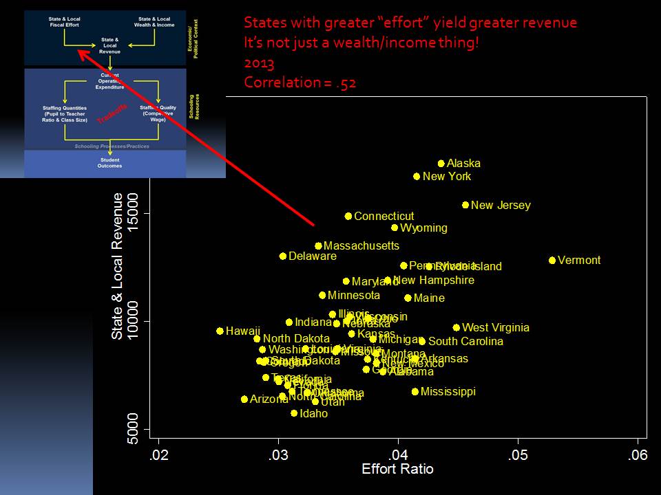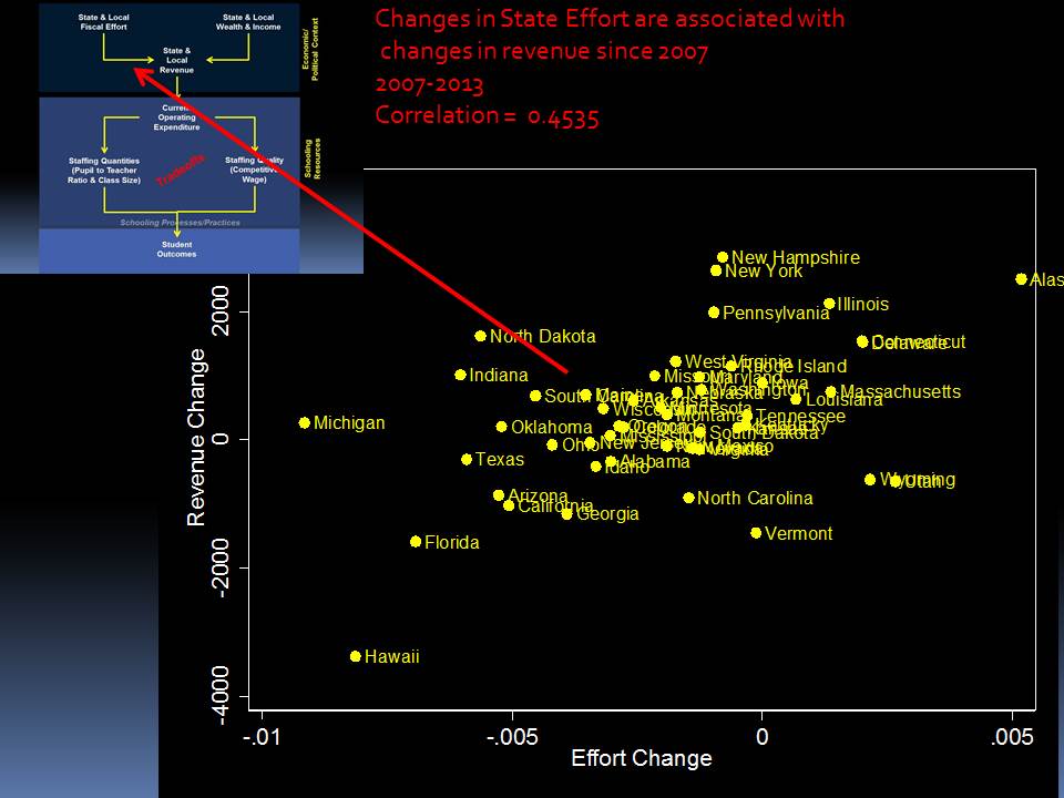 Note: Changes in effort from 2007 to 2013 are associated with changes in revenue. Many states have reduced their effort and revenue toward public schooling since 2007. That is, it’s not just the economy stupid.