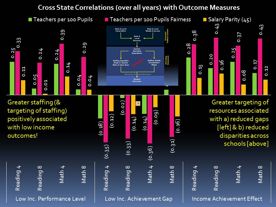 Note: It also turns out that in states where spending is greater in higher poverty districts, so too are staffing ratios. That is, more progressive cross district distributions of spending are associated with more progressive distributions of staffing (where more intensive staffing, including smaller class sizes, are needed for reducing achievement gaps).