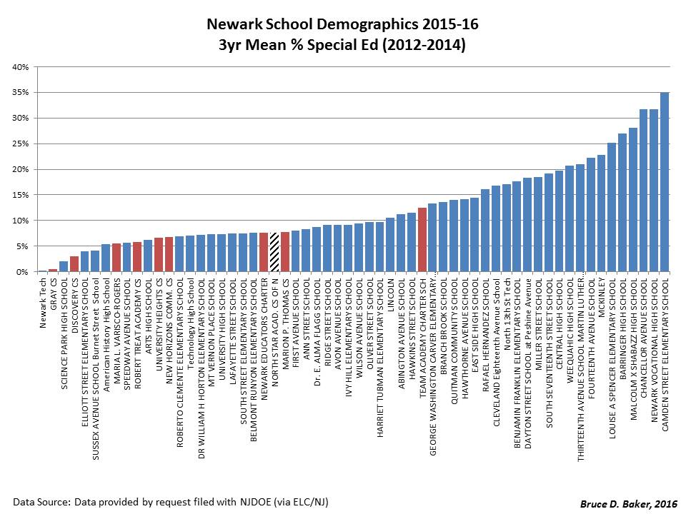 RED bars indicate CHARTER schools. Blue are other Newark Schools. North Star highlighted w/diagonal pattern as it has been the subject of recent twitter/blog fodder/debate.