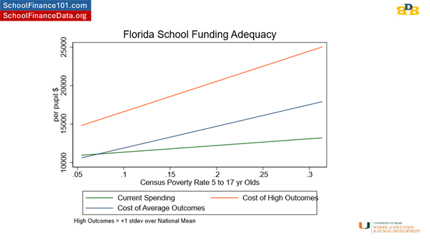 Now, in my report, I explained how the Florida Supreme Court said there’s really no way to set a manageable standard for what’s adequate anyway, so the legislature should just do whatever it wants. Well, those red horizontal lines aren’t just manageable standards, they are reasonable empirical predictions that could be directly used in guiding the state school finance formula. But, silly me, with my data and models (courts in other states have relied heavily on such evidence for setting such standards).