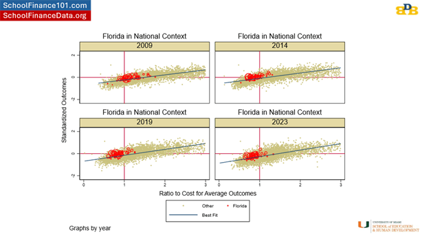One upside for Florida districts is that they generally sit on or above the diagonal line which might be interpreted as representing average efficiency in producing outcomes. Florida school districts are efficiently producing the outcomes they produce – getting better than expected outcomes. By the way, that’s what actual efficiency analysis looks like – not the DOGEY BS we keep hearing about. It’s about rigorously evaluating the quality of output of a business or government entity, given the inputs, and NOT about creating faux outrage over some anecdotal line item on an expense sheet.