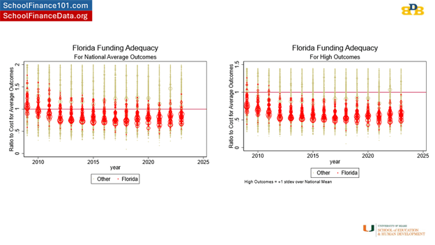Not shockingly, relating back to my report linked above, there’s a connection between these performance declines and the inadequacy of funding provided to Florida public schools over the past decade. As I explained in my report – and in several other reports and peer reviewed articles – I have a model based on data for every school district in the U.S. which generates predictions of the spending needed in each school district to achieve different levels of student outcomes (standardized reading/math outcomes).