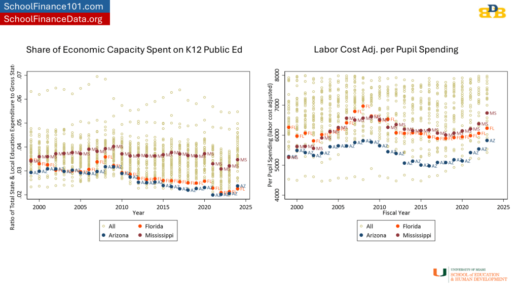 The solution is adequate funding. At least for Florida – here and now. And yes, Florida can afford that solution. Florida is near last in the country on the share of its economic capacity spent on K12 schooling. As a result, Florida school districts actually spend less, in adjusted dollars, per pupil than they did in 1993 and now spend less than Mississippi. Woohooo. Yay for Florida again. As I point out in my report linked above, even if Florida merely spent the same share of state GDP on public ed now as in the mid 2000s, the state would spend nearly 30% more than it does now. That would close a significant portion of the funding gap toward moving the state back to average outcomes. Still not high. But not falling off the cliff they have been for the past several years.