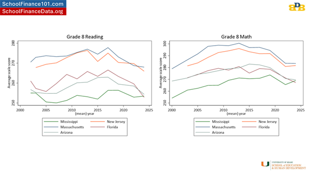 I’ve pointed out on several occasions recently that Florida schools have continued their rapid decline in 8th grade outcomes in reading and math. Florida is one of the reasons why Mississippi’s overall rank improves on national assessments. Yay for Florida.