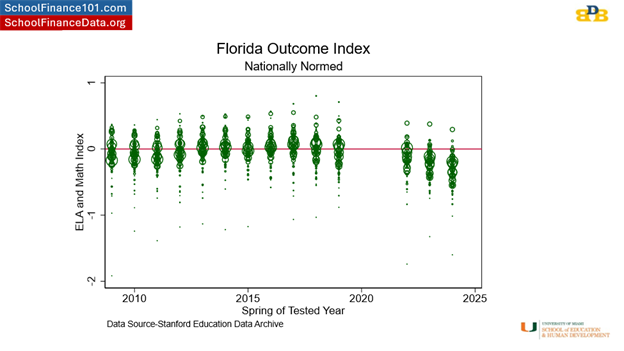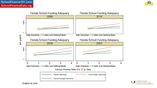 Not shockingly, relating back to my report linked above, there’s a connection between these performance declines and the inadequacy of funding provided to Florida public schools over the past decade. As I explained in my report – and in several other reports and peer reviewed articles – I have a model based on data for every school district in the U.S. which generates predictions of the spending needed in each school district to achieve different levels of student outcomes (standardized reading/math outcomes).