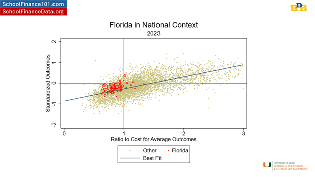 One upside for Florida districts is that they generally sit on or above the diagonal line which might be interpreted as representing average efficiency in producing outcomes. Florida school districts are efficiently producing the outcomes they produce – getting better than expected outcomes. By the way, that’s what actual efficiency analysis looks like – not the DOGEY BS we keep hearing about. It’s about rigorously evaluating the quality of output of a business or government entity, given the inputs, and NOT about creating faux outrage over some anecdotal line item on an expense sheet.