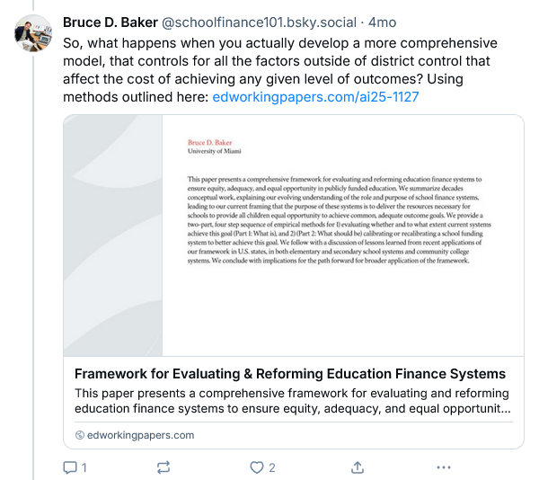 Below is an excerpt from my 2018 book Educational Inequality and School Finance . In many ways, I think this one passage is among the most important in the entire book. Below, I’ve bolded a few sections I think are especially important. This passage builds on a chapter Preston Green and I wrote for the original Handbook of Education Finance and Policy (2008) in which we tried to develop a unified framework for understanding equal educational opportunity and educational adequacy. I’ve written in recent posts how it is absolutely necessary that conversations around reforming state school finance systems be guided by clear and consistent principles, which can be coherently linked to both legal frameworks and empirical analyses and models.
