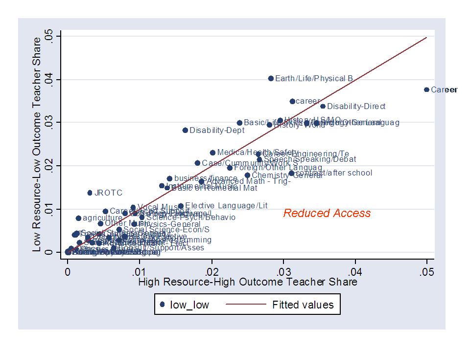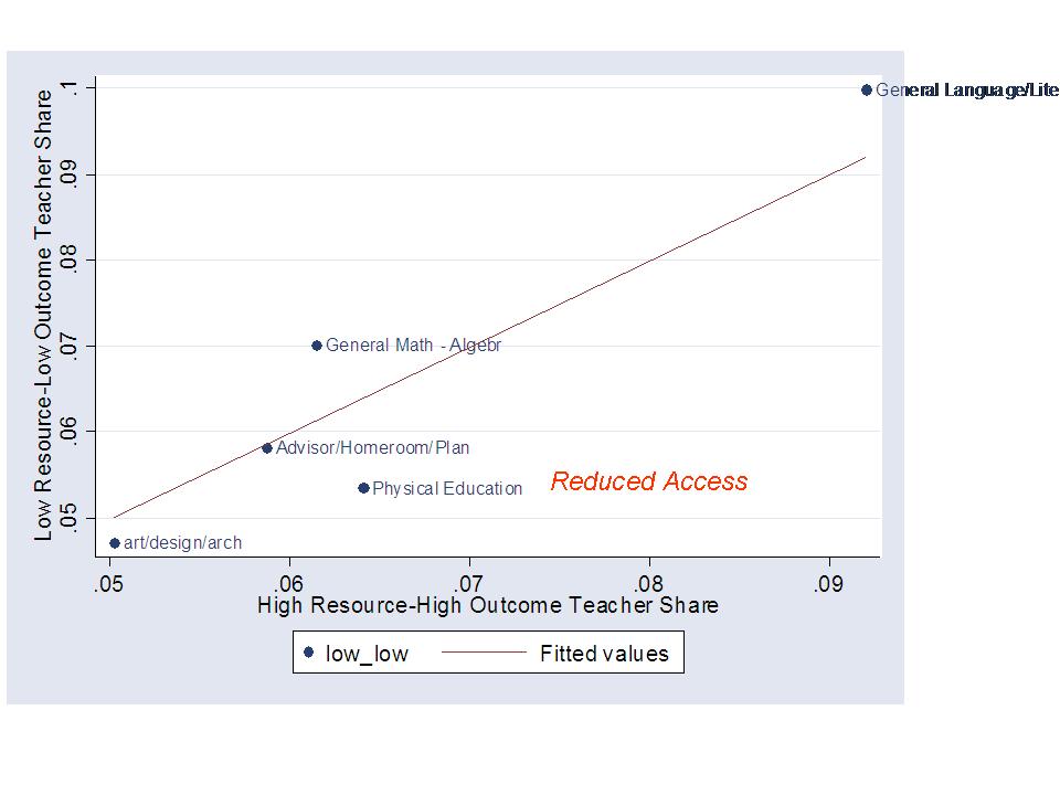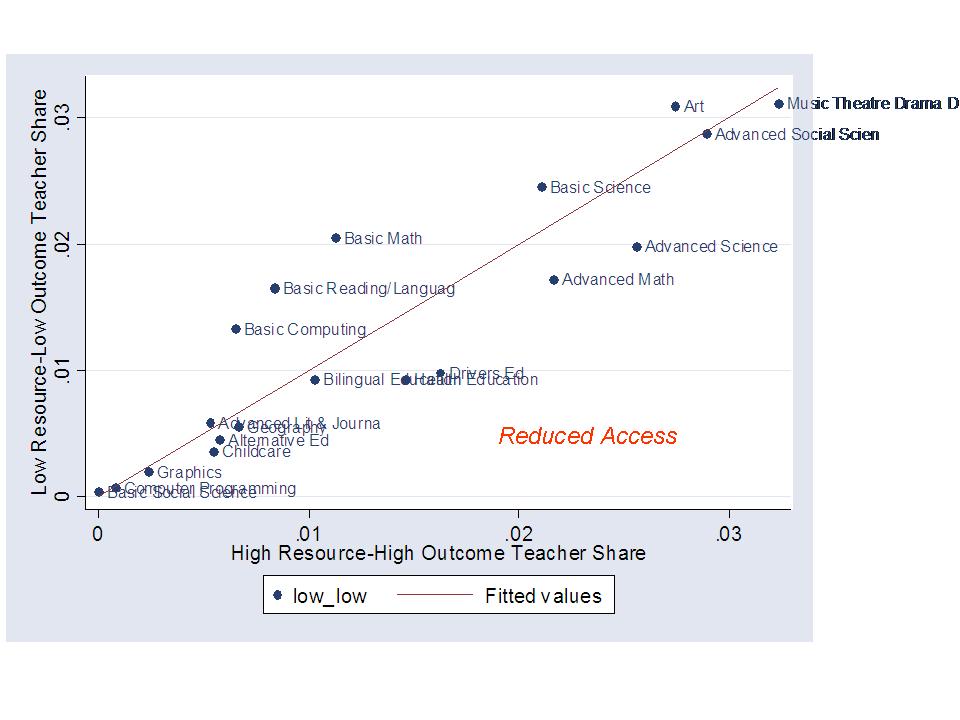 Hmmm… disadvantaged districts have far fewer total positions per child, and if we click and blow up the graph, we can see some striking discrepancies! Those high need districts have far more special education and bilingual education teachers (squeezing out other options, from their smaller pot!). Those high need districts have only about half the access to teachers in physical education assignments or art, much less access to Band (little or none to Orchestra), and significantly less access to math teachers!