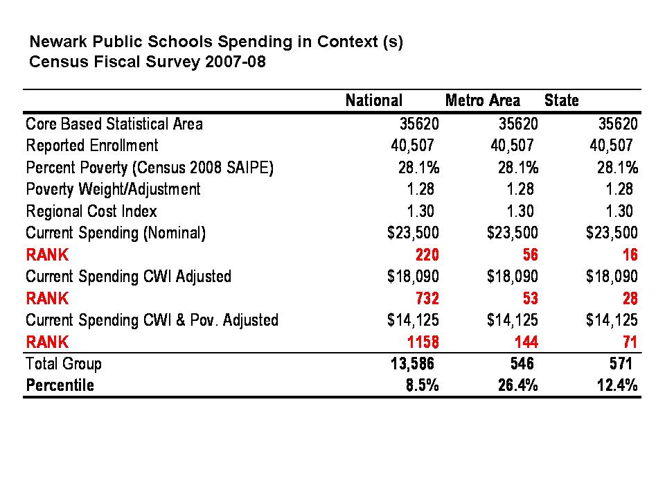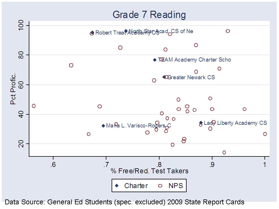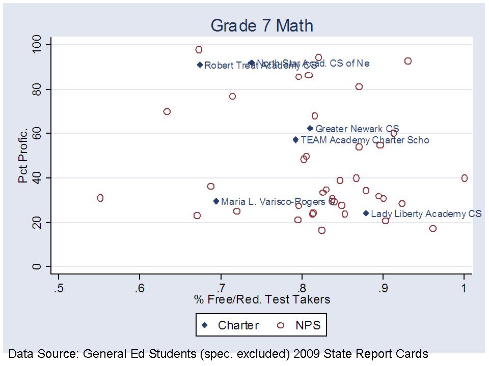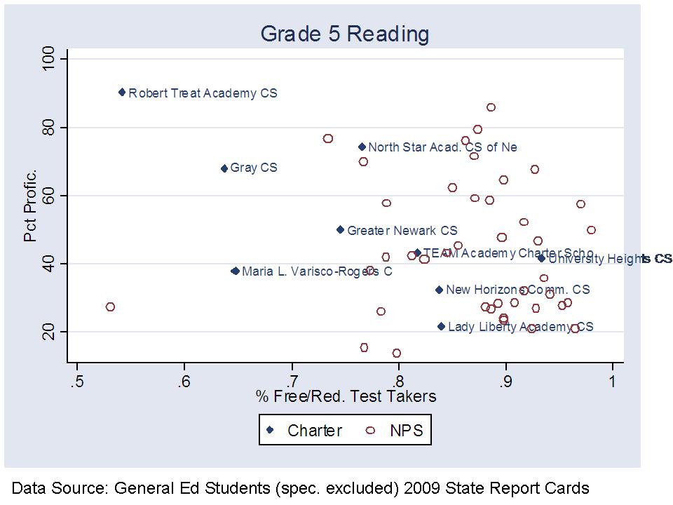 As an example of the belligerent denial side of the conversation, the following statements come from a recent slide show from officials at the New Jersey Department of Education, regarding their comparisons of charter school performance, and in response to my frequently expressed concern that New Jersey Charter schools tend to serve larger shares of the “less poor among the poor” children. Here’s the graph for Newark schools.