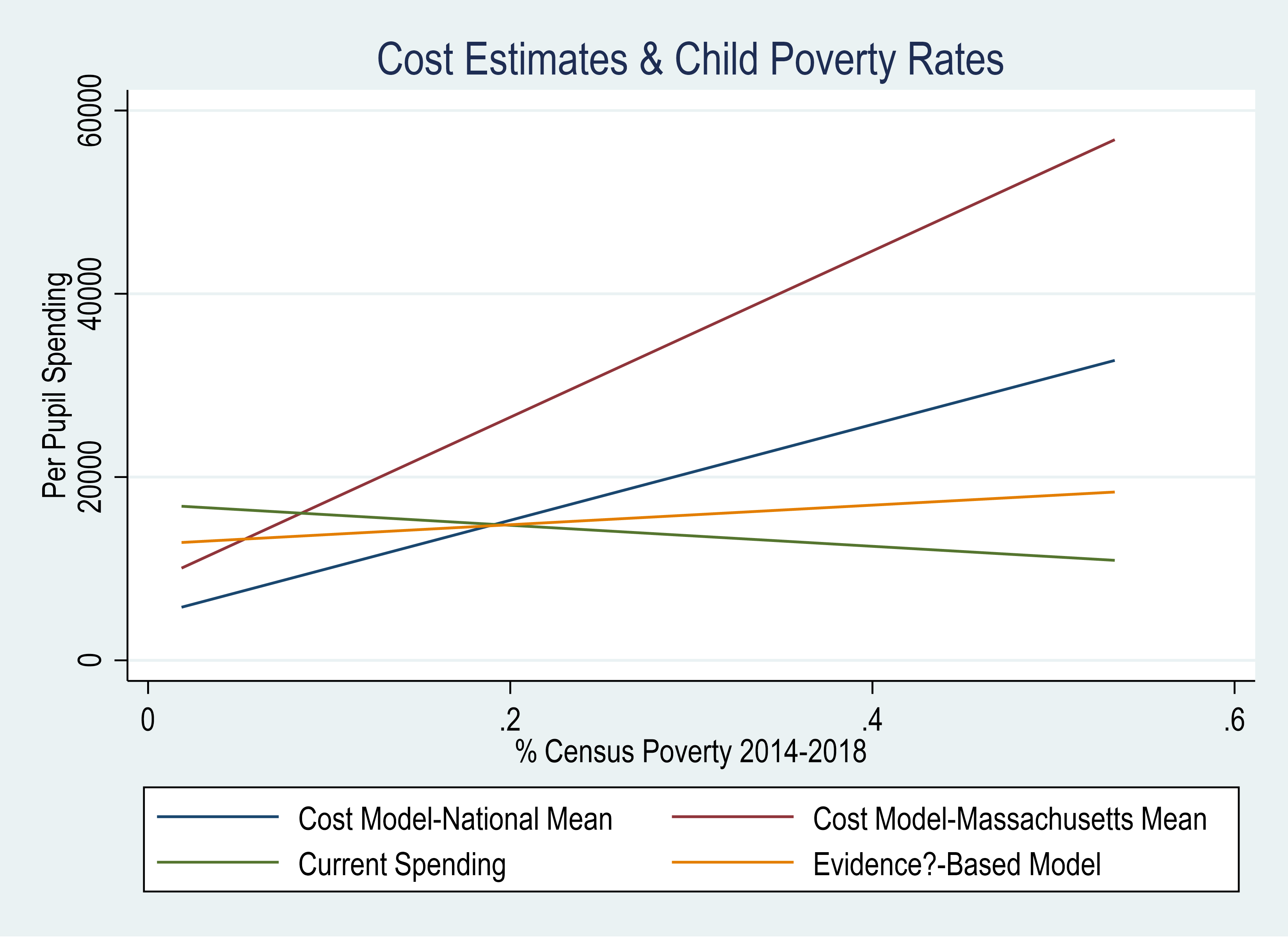 Table 1 puts some specific numbers on current spending versus cost targets from the state’s EB model and our National Education Cost Model. Sorted by poverty quintile, the Evidence Based model suggests only modest increases for the highest poverty quintile and does, on average, suggest that much lower poverty districts could get by with less than they presently spend.
