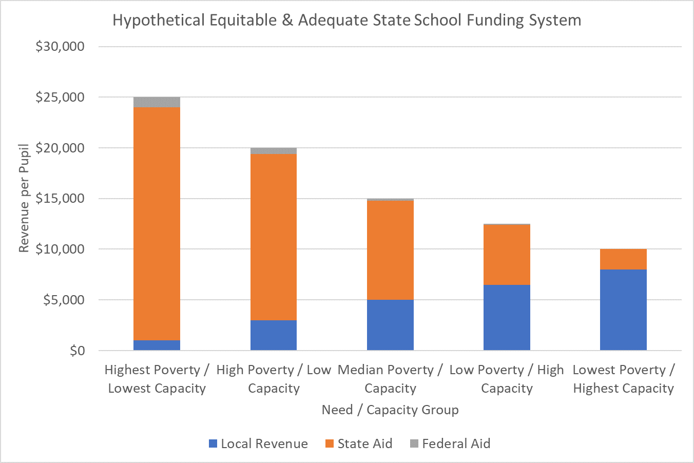 Mandate a minimum local contribution (equalized for wealth) and allocate state aid to fill the remaining gaps.